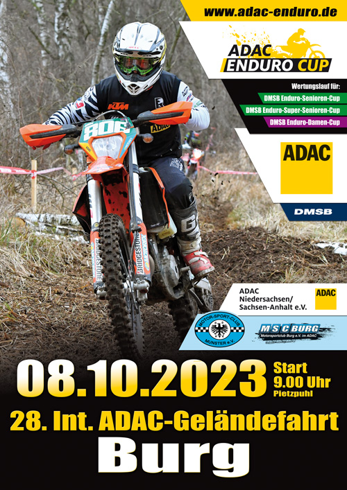 Auf dem Weg zu ihrem Saisonfinale in Kempenich legen die Damen, Senioren und Super-Senioren noch einen Zwischenstopp in Burg ein. Die traditionell als Zwei-Tages-Fahrt ausgetragene Veranstaltung bei Magdeburg, geht in diesem Jahr lediglich über einen Wertungstag, den 8. Oktober 2023. Neben den bereits erwähnten drei DMSB-Enduro-Cup-Klassen, zählt die Geländefahrt zum diesjährigen ADAC Enduro Cup. Natürlich kann auch in den offene Klassen genannt werden oder in einer speziellen Einsteiger-Klasse, die all denjenigen vorbehalten ist, welche in den Endurosport einmal hinein schnuppern möchten. Zudem gibt es eine eigens initiierte Mannschaftswertung mit Preisgeld für die drei besten Teams.