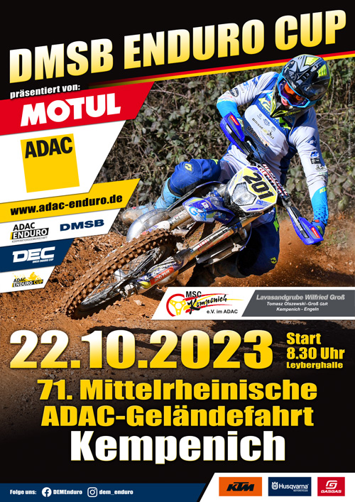 In den Klassen E1B und E2B halten Fritz Hunger und Arvid Meyer mit jeweils 17 Punkten Vorsprung die besten Karten in der Hand, während es in der Klasse E3B zwischen Niclas Leon Kallmeyer und Florian Geisenhofer mit sechs Zählern Unterschied deutlich enger zugeht. Eine noch knappere Entscheidung bahnt sich im DMSB Enduro-Mannschaftspokal an. Hier liegen die Nachwuchs-Teams des ADAC Niedersachsen / Sachsen-Anhalt und des ADAC Sachsen gerade einmal zwei Punkte auseinander. Wie die Konstellation bei den Senioren, Super-Senioren und Damen vor dem Saison-Finale aussehen wird, muss sich erst noch zeigen, da diese zuvor noch einen Wertungslauf in Burg zu absolvieren haben. „Und dann haben wir ja mit Tanja Schlosser noch eine frischgebackene Europameisterin am Start. Darüber freue ich mich ganz besonders“, frohlockt Ralf Caspers, der schon jetzt mit seinem Team unzählige Stunden in die Vorbereitung zur 71. Mittelrheinische ADAC-Geländefahrt Kempenich am 22. Oktober 2023 gesteckt hat.